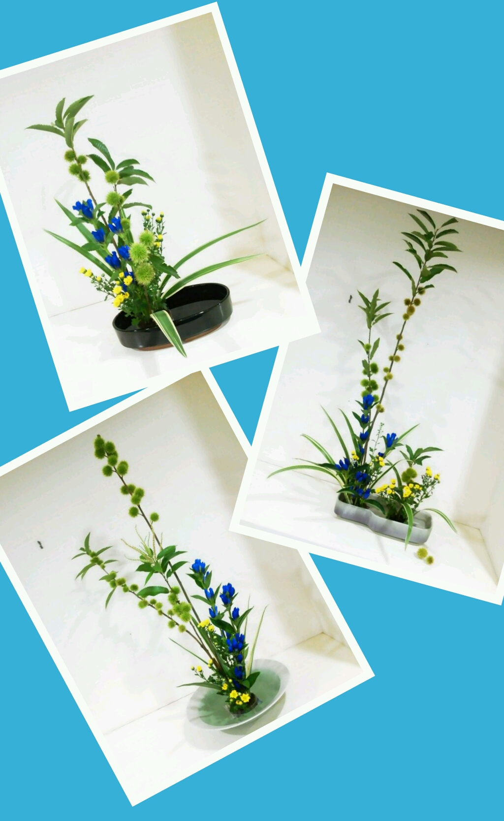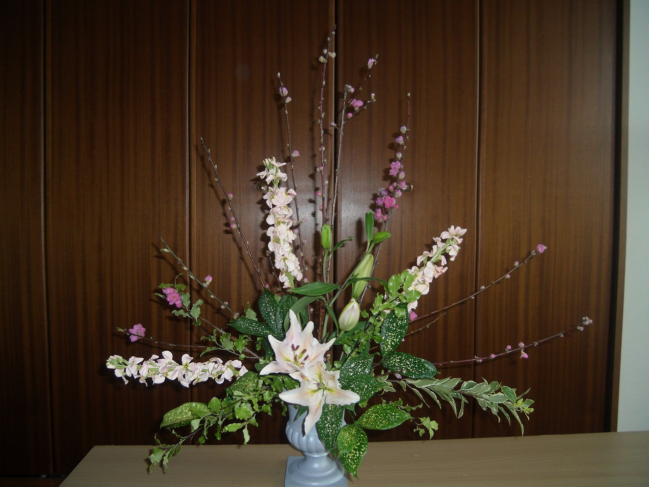 「虎の尾桜」「ベビーティアーズ」「紫蘭」で、自由花を生けました。
