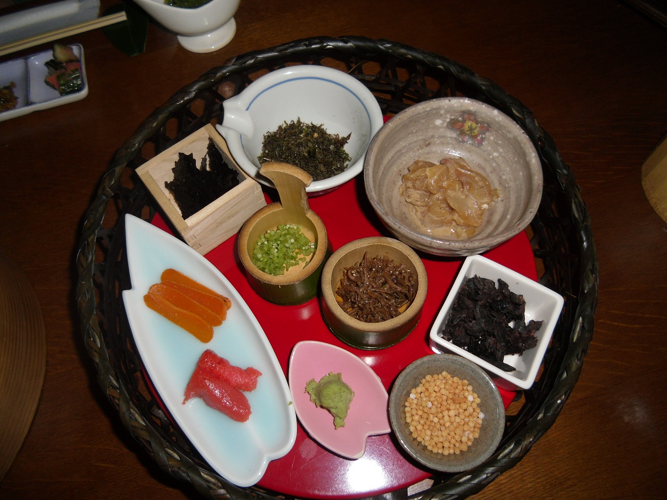 味の干物に自家製豆腐、朝からつ茶漬け。お茶漬けの具だくさん。