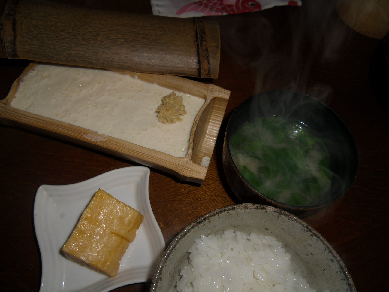 味の干物に自家製豆腐、朝からつ茶漬け。お茶漬けの具だくさん。