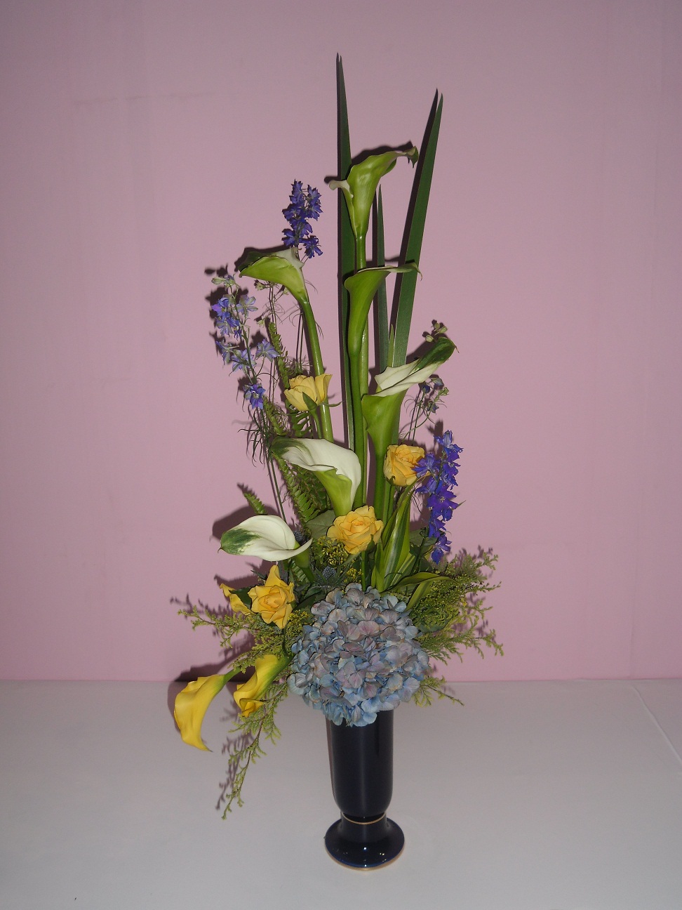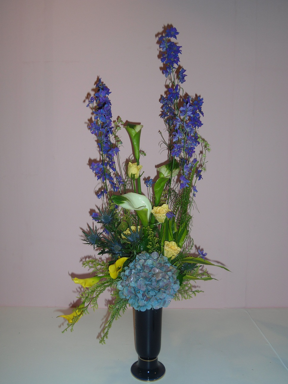 ブルーのべラドンナと反対色の黄色いバラとカラーでアクセントを。