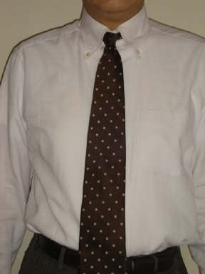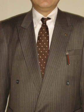 ブラウンにピンクの水玉のネクタイでコーディネートです。